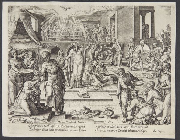 Curator: Looking at Philips Galle’s 1575 engraving, “The Burial of St. Stephen,” I’m struck by the quiet solemnity achieved within such intricate detail. The architecture dominates, framing the intimate burial scene, yet it almost dwarfs the figures. What is your immediate response to the work? Editor: There’s a pronounced stillness in this image. The stark monochrome of the engraving throws the scene into sharp relief. You can almost feel the texture of the fabric they're using to lower St. Stephen’s body – the sheer physical act of handling the weight. And it all comes from carved metal! Curator: Indeed, the material process behind engravings significantly impacted the artwork’s distribution. Prints democratized art, disseminating imagery like this throughout society. The subject, St. Stephen, was an early Christian martyr whose story had real socio-political weight. Galle, through prints, participates in this public role of art. Editor: And consider the skill involved! Each line carefully etched, thousands of them perhaps, to render this weighty moment. The engraver isn’t just illustrating a story; they are involved in an act of labor-intensive, skilled production. What would have the workshop looked like where it was made? What type of tools were being employed and what was its final use- value as art? Curator: It's vital to consider where it was exhibited – probably circulated among private collectors or monastic settings. The art style situates this engraving squarely in the Northern Renaissance tradition of detailed representation. Observe the orthogonal perspective of the colonnade receding into space, a key device utilized to enhance the narrative’s stage. It is clear why narrative artwork was becoming extremely popular in those settings! Editor: Absolutely, and even the contrast plays a significant role. Look at St. Stephen, all muscle, contrasted against the cloth, so soft and pliable! What was this made with? It reminds us that materials convey messages as powerfully as the figuration does. You need good linen for burying your saints properly! Curator: Right, the act of memorializing Stephen, embedding him within both theological and art-historical dialogues. The act of circulation and visibility adds layers to understanding art’s function in history. Editor: Precisely. Looking closely reveals how the production shapes our experience. The sheer physical making is key to seeing that this image asks how we assign worth, both spiritually and materially. Curator: That’s insightful – I leave this work appreciating more than just the image of Stephen, but of art making at that time! Editor: For me too! Reflecting on materiality helps me connect to that historical workshop with real hands holding very small instruments.