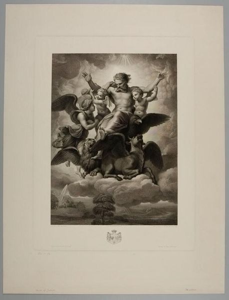 Editor: This is Pieter Tanjé's "Flora," currently residing in the Harvard Art Museums. It depicts the goddess Flora surrounded by cherubs. The cloud formations appear meticulously rendered. What compositional choices stand out to you? Curator: The strategic deployment of chiaroscuro immediately commands attention. Observe the stark contrast between the ethereal light illuminating Flora and the cherubs, and the denser shadows that define the cloudscape. How does this manipulation of light and dark influence your perception of depth and form? Editor: It gives the figures a sense of volume and separates them from the background. Curator: Precisely. Moreover, consider the use of line. Notice the delicate, almost fragile quality of the etched lines that define Flora's drapery, juxtaposed with the bolder, more assertive lines delineating the clouds. Editor: I see it now. The lines create such a soft, elegant mood. Curator: The composition clearly plays with the interplay of form and void, solid and ethereal. It encourages us to consider the underlying structure that supports this visually arresting image. Editor: I’ve certainly learned to appreciate the technical skill involved in creating such depth through contrasting light and line work.