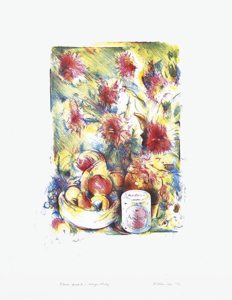 Curator: This delicate watercolor is titled "Vase d'Anemones" by Théophile Alexandre Steinlen. The artwork focuses on a vibrant bouquet displayed in a tall blue vase. Editor: My first impression is one of gentle melancholy. The muted tones, almost a whisper, highlight the vibrant but fleeting nature of beauty, like a memory fading. Curator: Indeed. Steinlen, known for his depictions of Parisian life, often infused his work with social commentary. Even here, with this seemingly simple still life, one wonders if he's reflecting on the transient nature of pleasure within the bustling city. Anemones, you know, were becoming quite a fashionable, almost commodified flower in the era. Editor: Precisely, and considering their varied colors and the fact that anemones were named from the Greek word for "windflower", could suggest an almost allegorical dance of different emotional facets – grief, fleeting joy, memory – swirling in the same symbolic space. Red anemones symbolize death in mythology, for example, whereas the others are more about the beauty of spring. Curator: An interesting connection. This wasn't produced in a vacuum. We have to think about the rise of impressionism in general, where quick brushstrokes were designed to portray a fleeting sensation and immediate reflection, to depict the social rise of the petite bourgeoisie who bought art in ever greater numbers, and the role that the flower itself began to play in consumerism. Editor: And the vase itself–notice how its cool color grounds the composition and directs our gaze upwards toward the blossoms. That intense ultramarine draws a definite contrast against the white background in a way that seems both comforting and unnerving, when one considers its possible relationship to themes of water and sky – potential gateways between our reality and an almost spectral elsewhere. Curator: It truly showcases how Steinlen's unique lens manages to blend his critical social consciousness with intimate observation of the human condition and still-life genre in France. Editor: A beautiful conversation sparked from something seemingly so simple! It reinforces how powerful seemingly simple domestic motifs can act to unpack greater complexities.