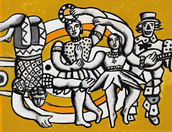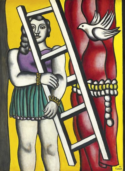 Editor: This is Fernand Léger’s “Big Julie,” painted in 1945, an oil on canvas. The first thing that strikes me is the stark contrast between the black and yellow backgrounds. It’s so visually arresting. What do you see in this piece? Curator: Indeed. Let us focus on the compositional elements. Notice the dichotomy between the organic form of the figure and the hard, machine-like abstraction beside her. The interplay between line and shape creates a tension that's integral to Léger's work. Editor: That's a great point! It almost feels like she is both connected and disconnected from that mechanical shape. Are there ways of understanding Léger’s palette? Curator: Observe how the colors, primaries mainly, are used as building blocks, each section boldly defined. This is a calculated choice, avoiding subtle gradients for a forceful declaration of form. Léger simplifies to amplify, creating almost a blueprint of a figure. Does the lack of shading remove or heighten her essence? Editor: I hadn't considered that. The simplified palette definitely makes it more about shapes and less about realistic representation. Are those symbolic elements present too, such as the butterflies? Curator: Butterflies are interspersed amid other visual signs and are, indeed, interesting. Notice how even those seemingly whimsical details – are reduced to flat, graphic symbols. They interact as shape elements alongside, say, the figure's stylised headdress. These function almost like components of a designed surface rather than symbolic carriers of meaning, no? Editor: I can see that now. The piece feels very deliberate, carefully constructed rather than emotive, or expressive. Curator: Precisely. One departs understanding not feelings necessarily but a heightened sensibility towards organization and material composition. What new appreciation has been built here for you? Editor: Well, I realize it’s less about a ‘who’ and more about a ‘what,’ and its building block components in relation with one another as shapes and colors.