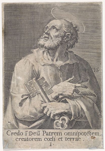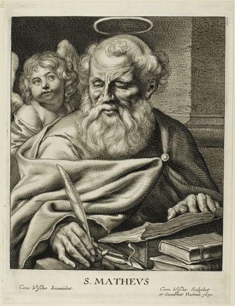 Egbert van Panderen made this engraving of the Apostle Matthew in the 17th century. It’s a print, so we are looking at an image made possible by the repetitive action of a press, and the skilled labor of a professional printmaker. The engraving process involved carefully incising lines into a metal plate, inking it, and then transferring the image onto paper. Notice the incredible detail achieved through this process; the textures of the Apostle’s skin and clothing are meticulously rendered. The lines create a sense of depth and shadow, giving the image a sculptural quality. The square he holds symbolizes his association with architecture, traditionally referencing the construction of the spiritual temple. It's fascinating to consider the labor and expertise required to create this print. The level of skill involved elevates this from mere reproduction to a work of art in its own right. The print exists as a testimony to the cultural and economic systems that elevated craft to fine art, but often obscured the contributions of the skilled laborers behind its creation.