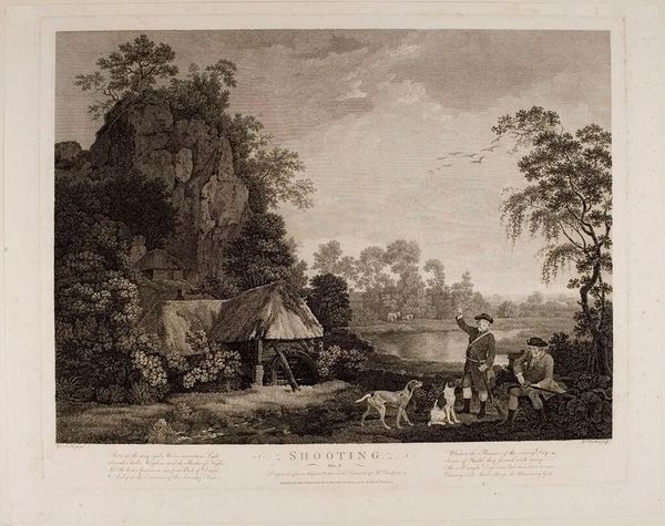 Curator: What strikes me first is the serene, almost idealized, quality of this scene, even though the men are actively preparing to hunt. There's a tension there. Editor: Indeed. This is "Twee jagers maken hun geweer schoon," or "Two Hunters Cleaning Their Guns," a print possibly from 1769, now held at the Rijksmuseum. The engraver was William Woollett. It speaks volumes about leisure, labor, and class dynamics of that era. The medium, engraving, tells a crucial story itself. Curator: Absolutely. Engraving requires a mastery of tools and meticulous process – think of the labor and the highly developed skill needed. These prints circulated widely, influencing perceptions of the English countryside and its inhabitants. How do we see that reflected here? Editor: Note the setting. We're not in a wild, untamed landscape, but rather one carefully managed and cultivated. The two men, presumably gentlemen hunters based on their attire, are attended by dogs. This wasn't about sustenance. Hunting was very performative and restricted along social strata. Consider who had access to the means of production to shape these visual narratives. Curator: Right. The social context is clear. These hunting scenes were produced, consumed, and controlled by an elite demographic. And the visual vocabulary is worth mentioning: landscape, genre painting, academic art -- each with its own codes. Did you notice how the natural environment dwarfs the working men, literally placing labor in subordination to both class and natural production? Editor: I find myself considering its impact on broader notions of masculinity and dominance. How does this image naturalize hierarchies? It presents a specific, arguably romanticized, view of rural life that served specific interests. Who owned the land? Who benefitted from hunting? Who cleaned the guns, really? Curator: Precisely. This print serves as propaganda, but it's crucial to understand the mechanics and networks that supported these forms of imagery. Editor: So when we view the natural setting, which is pretty indeed, we ought to bring the material world into sharper focus: consider who produced the work, and how class and social power influenced how the image came to be produced and circulate. Curator: Well, thank you; this exploration of context adds new layers to this work and broadens my insight of Woollett and how his engravings operated within specific socio-economic and aesthetic structures of 18th-century print culture. Editor: It also speaks to art history's potential for fostering dialogue, so as we revisit such landscapes, we remain cognizant of how narratives intersect with reality.