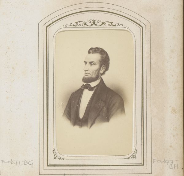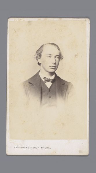 Curator: Here we have a studio portrait from the Abdullah Frères, dating to between 1863 and 1866. It’s a daguerreotype depicting a man with glasses. Editor: Oh, my. There's such a stillness to it, almost mournful. It feels like capturing a ghost rather than a person, that gaze is distant. Curator: The photographic medium, particularly in this early form, really lends itself to that impression. Look at the sharp focus contrasted against the blurred edges – it directs our gaze. Editor: It makes the figure appear almost like a cut-out, pinned to this backdrop. The sepia tone further amplifies that vintage, almost vanished, sentiment. I wonder what his story was, if he felt that disconnected himself. Curator: The formal attire indicates a certain social standing, even within the focused rigidity of portraiture, it hints towards the semiotics of Victorian status and power, codified through details such as the precisely knotted bow tie. Editor: Exactly! But what I find truly amazing is this tension between capturing such formality whilst losing any spark of vitality in translation. It seems so hard to gleam a soul from early photography! I mean look at his hairline! It adds years. Curator: Hairline concerns may be universal. Though more generally, these portraits served the explicit function of conveying identity and aspiration to future generations, though filtered through aesthetic convention. Editor: Perhaps. But it makes me reflect on our own compulsion for capturing images, especially filtered portraits. A curated façade, much like this gentleman in his stiff collar! We strive for control and narrative in similar ways! Curator: Interesting perspective. One must always situate the object within shifting historical and personal perspectives. It challenges us to view art beyond just historical documentation. Editor: So well said! I began lost in wistful somber and now I am actively reframing my modern lens by his historic example! Beautifully eerie.