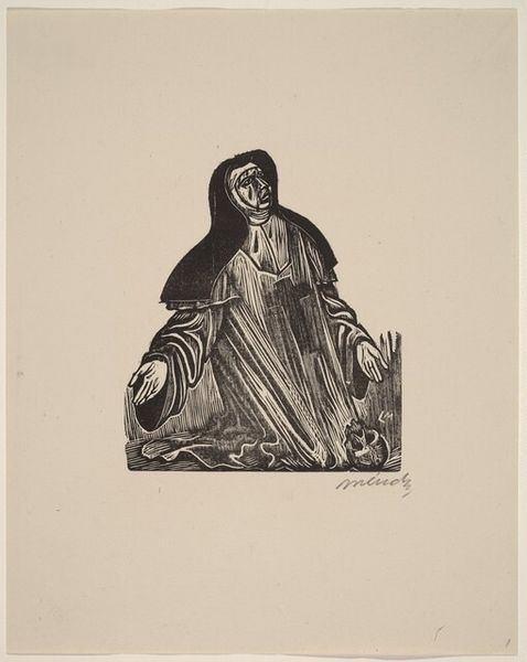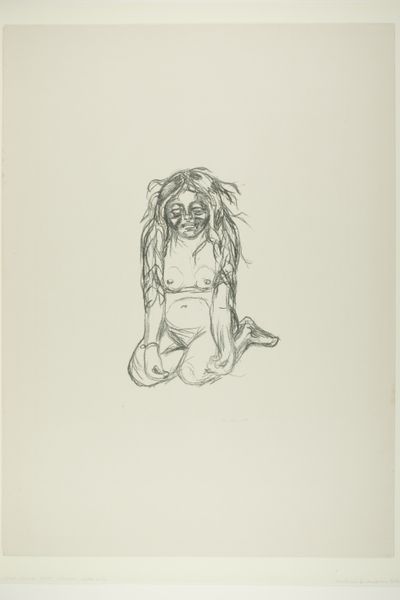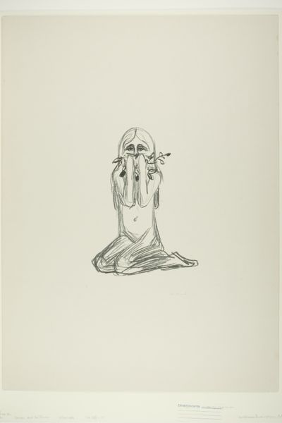 Edvard Munch made this lithograph called 'Omega's Eyes' on paper using crayon. The thing that grabs me here is the directness, the almost childlike simplicity of the lines. You can see the artist thinking through the image, line by line, as they build the form. Look at the hair, the way he suggests volume with just a few marks. It’s raw, immediate, and that’s part of its power. The surface of the paper is so present too, it's almost as important as the lines themselves. The grain of the paper seems to soften the image, but the stark black lines cut through the softness to give her eyes an intense sense of focus. The title suggests something about looking, being looked at, but maybe also about seeing something beyond the surface. Munch, like other artists such as Paula Rego, often embraces ambiguity, inviting multiple readings rather than offering fixed answers.