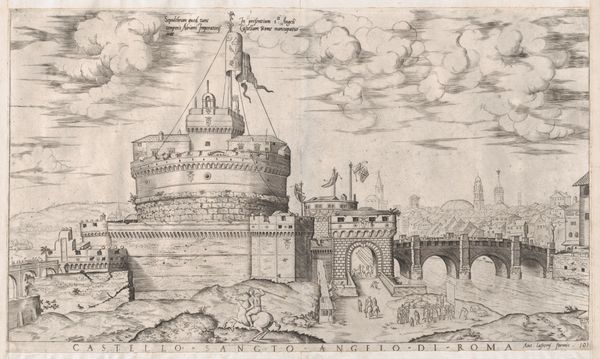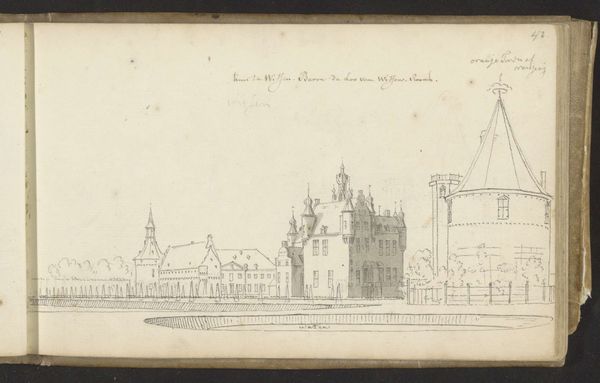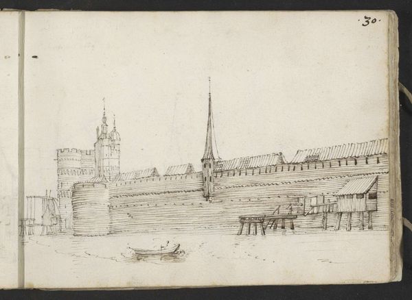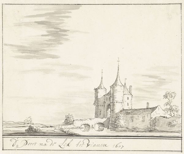 Curator: This evocative ink drawing is titled "Diezerpoort te Zwolle," created by Gerard ter Borch II, around 1631 to 1633. Editor: It feels like a quick observation, almost a snapshot. I love the immediacy of the pen strokes—rough but deliberate. Curator: Precisely. Ter Borch's skillful use of line weight creates a sense of depth, even with minimal shading. He focuses intently on the gate's structure, how it mediates the city’s access to waterways. Zwolle was a major trading hub, so the material function of this port – and Ter Borch’s meticulous documentation of its design - speaks to broader shifts in the Dutch Golden Age. Editor: It makes me think about borders, both physical and social. Ports weren't just points of economic exchange, but also sites of encounter and potential conflict. What did that imposing gate *mean* to the people who passed through it, particularly concerning Dutch identity at this pivotal moment in history? Curator: Good point! Ter Borch came from a family deeply involved in civic life. We might then consider the labor involved in constructing this massive gateway, the politics of fortification and control, the way the structure projects Dutch power. This wasn’t just picturesque scenery; it represents tangible social power and state apparatus. Editor: Right, and looking at it through that lens, one can ponder Dutch society’s complex relationship with openness and exclusion—the invitation to trade set against a looming promise of defensive impermeability. Curator: Yes. Note how the technique, essentially quick pen-work, belies the complex themes woven into the image. It's like Ter Borch's economical execution lets him document not just what the port looked like, but what it *represented*. Editor: It’s a testament to the power of art that even a simple sketch, made with accessible materials, can be layered with such meaning. Thanks to it, we may contemplate socio-political considerations concerning urban spaces and border control from centuries ago. Curator: Exactly, the drawing emphasizes labor, structure, and social role.