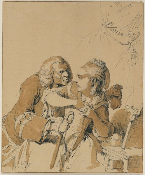 This intimate oval drawing, "Hofmakerij tussen elegant paar," by Herman Frederik Carel ten Kate, invites us into a world of subtle gestures and unspoken narratives. The artist, working with delicate lines and a muted palette, captures a scene where an elegantly dressed couple is enclosed within the frame. The composition itself, with its deliberate arrangement of figures and objects, seems to choreograph a silent dialogue. Notice how the lines guide your eye, creating a rhythm that mirrors the subtle interactions between the figures. The surrounding oval shape is creating a contained world. Is this a moment of courtship, intellectual exchange, or something more ambiguous? Ten Kate leaves us to ponder the multiple layers of meaning embedded within this formally intriguing sketch. The drawing destabilizes a fixed narrative, inviting ongoing interpretation.