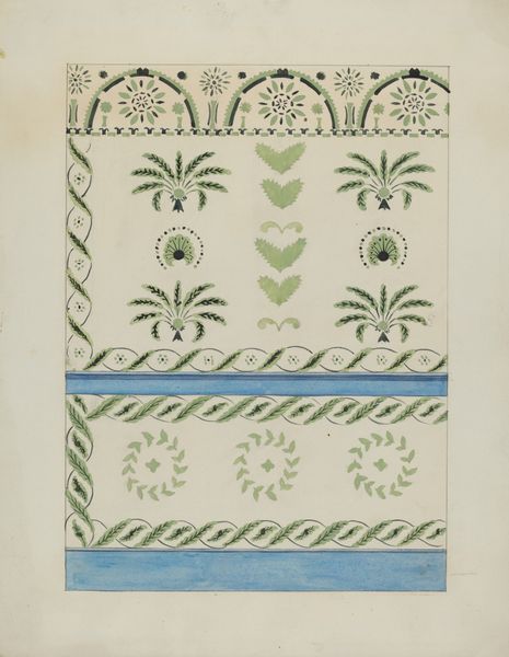 Martin Partyka created this Hand Painted Wall design, of unknown date, using paint. Partyka lived through tumultuous times, including both World Wars and the Great Depression. His artistic output reflects an engagement with folk art traditions. With its stylized floral motif framed by classical architectural elements, this design presents a fascinating intersection of the organic and the constructed. The color palette combines muted tones with pops of color. This evokes a sense of nostalgia, as well as perhaps a subtle commentary on the relationship between tradition and modernity. Consider how gender is subtly referenced through the floral design. It might traditionally be seen as feminine, while the architectural frame hints at more masculine structures of power. This piece seems to ask: how do we reconcile our cultural heritage with our present realities? The design invites us to reflect on the ways we decorate our spaces and, by extension, our lives.