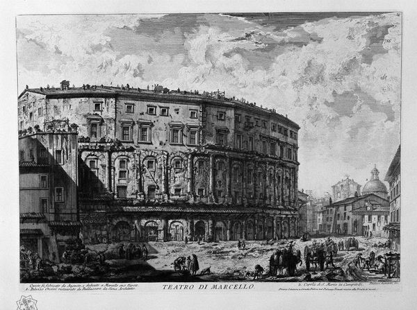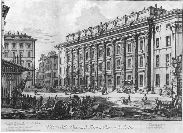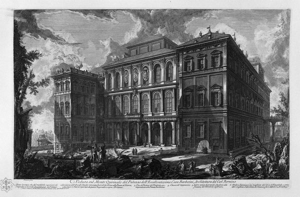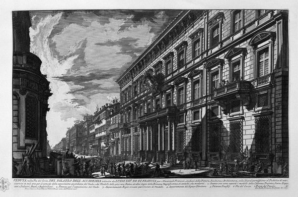 Editor: This is Giovanni Battista Piranesi's etching, "View of the Farnese Palace." The architecture just pops! It almost feels… theatrical? There's this really striking depth. What leaps out at you? Curator: The drama, darling, the delicious drama! Piranesi wasn't just showing us a building; he was crafting a stage. Think of those impossibly grand perspectives, slightly…off. Not wrong, just…enhanced. Like life itself, no? Makes you wonder if it is real or Memorex. I bet it seemed that way to viewers at that time, too. Have you considered what the printing process might communicate? Editor: Well, being a print, it's obviously reproducible, but beyond that… I'm not sure? Curator: It means Piranesi's vision of Rome, perhaps an idealized version, could travel. His etching democratizes the Palace for viewers across Europe, contributing to that Grand Tour fantasy. The sharp lines almost romanticize this Roman architecture. Notice how it towers? Doesn't it just dwarf those little figures in the foreground? Editor: Oh, I see! It’s about power. The building dominates the people. It feels like a stage set, everything is amplified! Almost like propaganda. Curator: Precisely. Piranesi wasn't just an artist, he was a storyteller and influencer. What have we learned, child? Editor: I learned that this is more than an architectural rendering; it's a carefully constructed argument about Rome’s grandeur that could be distributed. I am so excited! Curator: And I remember, yet again, that even old stones whisper stories, if you’re willing to listen.