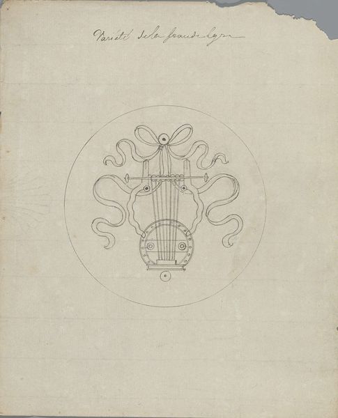 Pierre Félix van Doren created this drawing of a Lier in the 19th century. Immediately, the circular composition draws our eye, framing the intricate design of the lyre. The lyre itself is rendered with a delicate balance of straight and curved lines. Notice how the vertical strings contrast with the elaborate, swirling decorations that adorn the instrument's body. The drawing is a semiotic system of signs; the lyre, traditionally associated with music and poetry, is here deconstructed into its basic visual components. The surrounding ribbons add a sense of movement and fluidity, further emphasizing the contrast between the lyre's rigid structure and the organic forms. The subtle shading suggests a play of light and shadow, adding depth to the two-dimensional surface. This interplay destabilizes the established meanings of the object, by challenging our understanding of its form, it invites us to re-evaluate its cultural significance.
