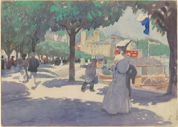 Curator: This is "Champs Élysées," a watercolor by Tsuguharu Foujita, created in 1951. It captures a bustling scene in one of Paris’s most famous locations. Editor: It feels instantly nostalgic. The light is airy, almost dreamlike. There's a palpable sense of joie de vivre—but also, for me, a touch of wistfulness in the palette. Curator: Foujita's approach here showcases an interesting convergence of Eastern and Western aesthetics. As a Japanese artist working in Paris, he clearly demonstrates plein-air, impressionistic sensibilities—notice how he handles light and shadow, suggesting movement and life in the leaves of those trees— but his line work is also quite deliberate, possessing a calligraphic quality. Editor: Yes, I see that. The figures, though rendered with quick brushstrokes, retain a certain precision. To me, they evoke archetypes more than individual portraits: the bourgeois mother, the wide-eyed child, the nanny—all stock characters performing their roles against the grand backdrop of Paris. Curator: Which tells a story about class and consumption as well. Note the materials visible; the linen of the women's dresses, the wrought iron of the chairs, all likely commodities of French production. There's also the clear delineation of public versus private space, which highlights an emergent, mid-century, postwar bourgeois desire for both entertainment and escape. Editor: Exactly. The Punch and Judy show serves as an escapist fantasy, but there are flags waving, and glimpses of monuments. To me they suggest lingering trauma from wartime that permeates everything in the everyday. Curator: Indeed. And Foujita had complex experiences during the war. Returning to the point about craftsmanship, though, he renders each tiny, discrete section of the scene. It makes it clear how the piece would have required great forethought as he deployed the watercolor across the page. Editor: The overall image creates a layered sense of national and individual memory, made poignant by the transient quality of watercolor. Foujita perfectly captures Paris as both timeless icon and ever-changing lived experience. Curator: Yes. Looking at it again, I see it as a subtle commentary on leisure and labour, a vibrant document of postwar French life produced with great technical precision.