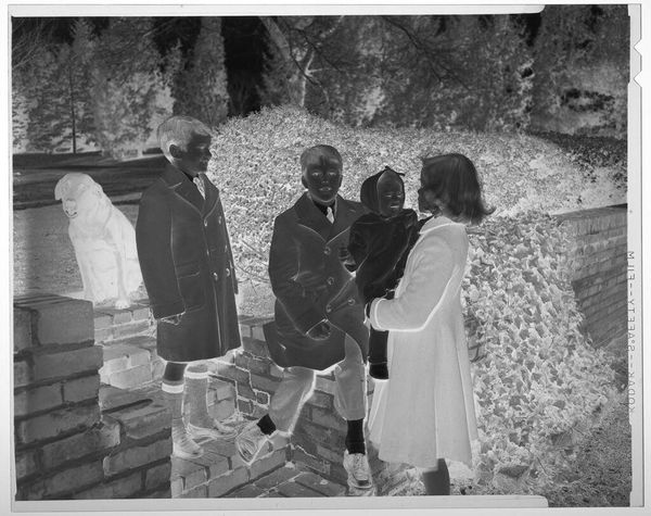 Curator: This intriguing gelatin silver print, attributed to Lucian and Mary Brown, presents a family group outdoors. Its inverted tones create an almost dreamlike quality. Editor: There’s a starkness to the composition that belies the seemingly ordinary subject matter. The reversal of light and shadow imbues the scene with a sense of unease and disruption, doesn't it? Curator: Indeed. It compels us to consider the photographic act itself, the power dynamics inherent in image-making. Who are these people? How are they positioned within a social hierarchy? Editor: The formality of their clothing—the suits, the dresses—suggests a deliberate performance of social roles. Even the children are carefully positioned, mirroring adult expectations. I keep noticing the lack of smiles. Curator: Perhaps this absence speaks volumes about the constraints of the time, the prescribed behaviors that dictated how one presented oneself to the world. This resonates with broader feminist critiques of representation. Editor: It's fascinating how the reversed tonality amplifies the symbolism; what is bright and hopeful becomes dark and obscured, urging us to reconsider accepted narratives. Curator: Exactly. It’s a powerful reminder to question the images we consume and the messages they convey. Editor: I agree. It makes me want to know more about the family.