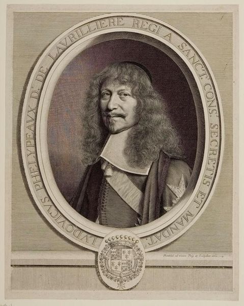 Editor: This is a portrait of Basile Fouquet by Robert Nanteuil, housed in the Harvard Art Museums. It looks like an engraving. What strikes me is the incredible detail achieved through what must have been a laborious process. What can you tell me about this work? Curator: Consider the engraver's skill as a form of specialized labor. Nanteuil reproduced likenesses for a consuming public, crafting images tied to social status. What does the ornate frame and the coat-of-arms suggest about the intended audience and Fouquet's position within the social fabric? Editor: It implies a wealthy, possibly noble class, valuing detailed representation and heraldic symbols. So, it’s less about pure artistry and more about production for a specific market? Curator: Precisely. Nanteuil’s workshop was essentially a manufactory of images, serving the needs of an elite clientele. Examining it through this lens demystifies the art object, grounding it in its material and economic reality. Editor: That’s fascinating; it shifts my perspective completely. I’ll definitely be thinking about art production differently now.