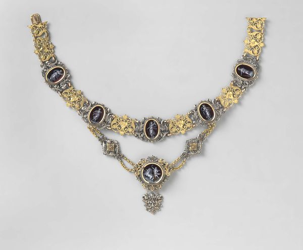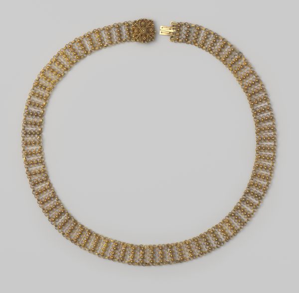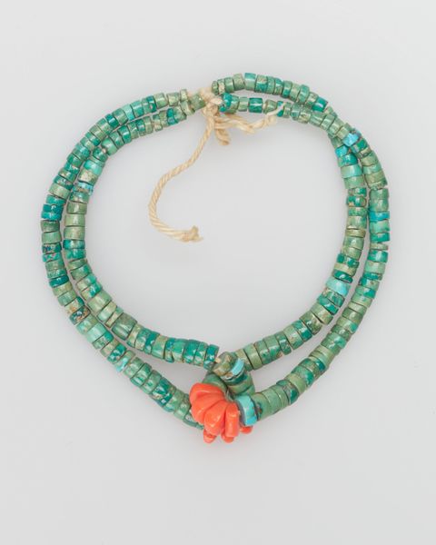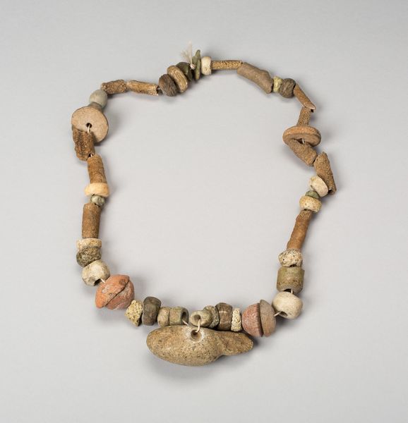 Editor: We're looking at a necklace, circa 200, crafted by the Colima culture. It's currently housed here at the Art Institute of Chicago. It strikes me as surprisingly delicate, especially considering its age, and I’m drawn to the repeated cylindrical and circular forms of the beads. How would you interpret this work through a formal lens? Curator: It is precisely the repetition of form, as you observe, that arrests the eye. Notice the variations within that repetition: the alternation of cylindrical and spherical beads. Furthermore, observe the tactile quality inherent in the material itself, the way the light catches the surface texture. What effect do these variations and tactile qualities have? Editor: It feels quite rhythmic. The variations prevent it from becoming monotonous, and there’s a real sense of craftsmanship in the texture. The beads look hand-carved. Curator: Indeed. Consider the subtle differences in carving on each cylindrical bead. This nuanced differentiation draws our attention to the material transformation: a raw substance shaped by the artisan’s hand. Do you see any interesting variations of tone or shade? Editor: The beads vary between lighter, almost white tones to more concentrated shades of orange, depending on whether they are in direct light. They reflect light differently based on the variations of hue across its structure. Curator: Exactly. Light animates the piece, revealing not just its form but its history of handling. Even now, centuries later, the material continues to articulate its inherent qualities through interplay with its environment. It offers a layered sensorial reading that only heightens the sense of craft at hand, and how form meets content. What do you take from that relationship? Editor: It’s amazing to see how much one can discern simply by observing form, structure, and material! Thanks to that emphasis, it's easy to appreciate the human touch.