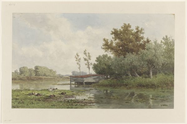 Editor: We're looking at "River Landscape with a View of a Village" by Fredericus Jacobus van Rossum du Chattel, likely painted between 1866 and 1892. It's a watercolor piece. There's this really quiet, almost melancholic feel to it...the muted colors and expansive sky create such a stillness. What do you see in this piece? Curator: It's funny you say that; I immediately felt a pang of something like…nostalgia. Perhaps because it evokes a slower pace of life, wouldn't you say? It's that quintessentially Dutch scene: the flat landscape, the reflective waterways. Du Chattel clearly had a fascination with light. Notice how he uses it to capture not just the image but the atmosphere of the scene. How do you think this reflects the influence of the impressionists? Editor: Well, you can definitely see it in the brushstrokes and the emphasis on capturing a fleeting moment. Unlike earlier landscape painters, he isn’t trying to idealize nature but presenting it in a more immediate, subjective way. Curator: Exactly! The muted tones, which create the hazy atmosphere. I wonder, could we almost taste the dampness of the air? That feeling of a low-hanging sky so specific to that region. But look closer, the man in the boat on the river going about their daily business…does that evoke genre-painting elements? Editor: It definitely adds a sense of narrative and every day human life against the backdrop of nature! And how the town, and especially the church spire anchors it, don’t you think? Curator: It's a dialogue between nature and civilization, and a perfect example of finding beauty in simplicity. It's really remarkable how much emotion he manages to convey with such restraint. What a refreshing observation. Editor: I'm struck by how it manages to feel both timeless and specific to its place. I'll remember that use of the medium, especially when trying to express emotion in my own artwork!