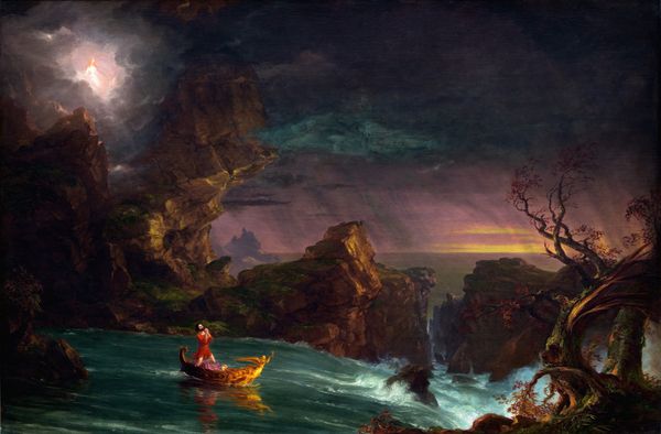 Ernst Fuchs created this artwork, titled ‘The Temple Island,’ using a medium that captures a dream-like, ethereal quality. The composition draws you into a world where architecture and nature merge under a sky ablaze with color. The painting’s structure relies on a masterful use of contrast: the cool, shadowy foreground against the warm, luminous island. Fuchs uses this contrast to create depth, pulling the viewer into the scene. The brushstrokes are loose, which adds to the dreamlike quality, blurring the distinction between what is real and what is imagined. The island itself, crowned with a classical temple, becomes a focal point, a symbol of order and reason amidst the fluid, unpredictable elements of nature. This juxtaposition invites us to consider the relationship between human structures and the natural world. Fuchs challenges fixed meanings by blending classical motifs with surreal landscapes, prompting a re-evaluation of our cultural symbols and their place in our collective consciousness. Ultimately, the artwork's structure and composition encourages an ongoing process of interpretation and reflection.