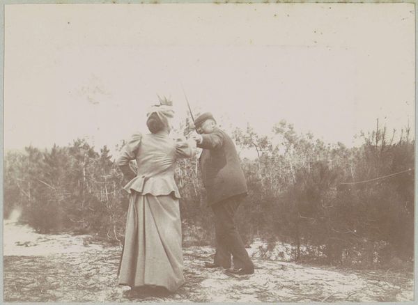 Geldolph Adriaan Kessler made this photograph, titled "Het Gezelschap op het strand bij Oilport Californië," sometime in the early 20th century. Here we see two men in suits walking along a rocky beach. Behind them, we see the cliffs rising up to meet the horizon. Kessler seems interested in the relationship between man and nature, but also perhaps the uneasy relationship between man, nature, and industry given the location is Oilport, California. This image creates meaning through the use of visual codes: the men in suits suggest wealth and power, while the desolate landscape suggests the impact of industry on the natural world. The photograph was made in a time of great social and economic change in the United States, and the rise of the oil industry was a major factor in this. The photograph may be a comment on the social structures of its time, as it shows the wealthy elite enjoying the fruits of industry while the environment suffers. To understand this image better, we might research the history of the oil industry in California and the social and economic conditions of the time. Only by understanding the social and institutional context in which it was made can we truly appreciate the meaning of this photograph.