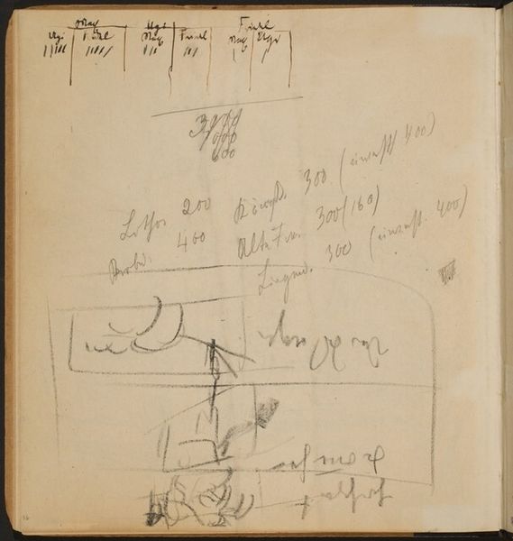 Curator: Looking at Willem Witsen’s “Annotaties,” made around 1888 to 1891, immediately evokes a feeling of…well, organised chaos, almost. Editor: It strikes me as a palimpsest of sorts. The paper itself tells a story of its making – the graphite smudges, the stains, all that labor of calculation! What kind of paper are we talking about here? Curator: The piece is graphite on paper. You see the dense calculations crowding the surface on the right side? In counterpoint there's a lot of vacant space to the left. The sum total feels deeply introspective. Editor: Definitely. We're getting a glimpse into Witsen's process, seeing the very arithmetic underpinning, say, a composition. How does the materiality of this relate to his more well-known prints and paintings? Is he using the material almost like an extension of his mind? Curator: I feel he is! Knowing his work, you'd be familiar with how he often explores quiet moments, using light to give everyday things a somewhat theatrical touch. Maybe that "ordinariness" is precisely what attracts him: to transform and celebrate everyday, commonplace material, that is cheap in origin, to find the unique beauty within them? I wonder if that might mirror an element within the broader aesthetic movements happening at that point in art history? Editor: Absolutely. It disrupts traditional hierarchies – this isn’t a precious material meant for display in a salon. It's a working document. And placing these private mathematical annotations on par with, for example, carefully crafted etchings… that’s quite radical for the period. Curator: And yet, look how deliberately the pencil strokes are crafted and repeated to get what the artist intended to create; despite them being simply what looks like annotations, there's also something rather beautiful about seeing all that work behind this art, with Witsen turning something so mundane into a delicate visual creation that speaks of a different world, maybe an unseen perspective. Editor: The labor certainly sings out from the piece, both literal calculation and artistic labor. It underscores that the final ‘art object’ emerges from layers of often unseen material and intellectual investment. Seeing those layers made visible can only enrich the work itself. Curator: For me it’s that combination of a mundane nature but, in its very being, manages to take our mind on a fascinating visual quest, which reminds me again how beautiful the intersection between the ordinary and unique can be. Editor: Exactly, “Annotaties” gives voice to the hidden material foundations on which creativity builds its most striking work.