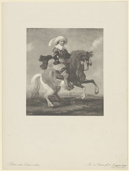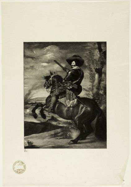 Léopold Flameng created this print, "Equestrian Portrait of Prince Balthasar Charles of Spain," using etching, a printmaking technique. The image shows a prince on horseback. Flameng incised lines into a metal plate, likely copper, with a sharp needle, exposing the metal. The plate was then immersed in acid, which bit into the exposed lines, creating grooves. Ink was applied to the plate, filling these grooves, and the surface was wiped clean. Finally, paper was pressed against the plate, transferring the ink and creating the print. Etching allows for fine detail and subtle shading. Flameng masterfully used the technique to capture the textures of the prince's clothing, the horse's mane, and the landscape. This print is not just an image; it's a testament to the labor-intensive process, the skilled hand, and the traditional techniques that elevate craft to art.