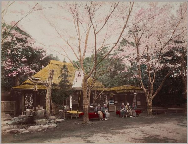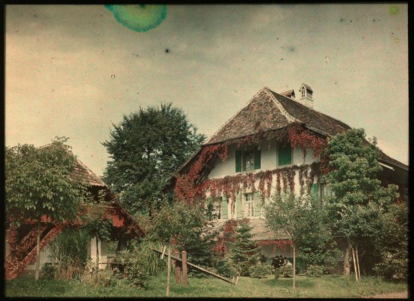 Curator: Adolphe Burdet’s photograph, “Gezicht op een boerderij (uiterst rechts) en een bijgebouw (?), met een man en een vrouw," was taken sometime between 1907 and 1930. The work resides here in the Rijksmuseum collection. Editor: I am immediately drawn to the stark contrast between the dark roof and the whitewashed walls. The architecture itself seems to embody a quiet, almost stoic quality. Curator: Indeed. Considering Burdet’s oeuvre, this photograph typifies an interest in rural life and the integration of people within their working landscape. The cottage with its heavy roof provides shelter and defines the material circumstances of their existence. We might ask what materials were readily available to create this dwelling and what vernacular methods were involved? Editor: But what is striking is how Burdet directs our attention through composition and light. The verdant vines serve as an intermediary between architectural rigor and natural abundance. Observe the way the steps lead the eye upwards towards figures absorbed by what seems to be their intellectual life – an intermingling between hard work, education and recreation. Curator: That’s right. We see this reflected throughout this body of photographs where similar compositions depict laborers at work, demonstrating their skills through manual craft – brick laying, or even something as basic such cutting down wood – documenting moments not captured by the traditional "high art" modes prevalent during that era. Editor: It is an everyday genre painting captured in photographic medium, and also worth paying attention to how the geometry inherent within structure creates pleasing contrast, as does color used carefully across surface details; both make you study every single minute texture. Curator: Perhaps this photograph urges us towards questions relating materiality; were color processes accessible? Is such vivid coloration indicative shift occurring societal attitudes, consumption opportunities - which enabled such expression. What social implications lie behind artistic exploration like these works show today. Editor: It seems the balance found throughout suggests equilibrium exists, despite its rigid appearance. Each detail adds greater complexity; the composition has harmony while suggesting so much tension lies deep underneath... Curator: Precisely; such layered approach reveals insight through material circumstance itself by reflecting socioeconomic conditions during historical context around these photos as it captures its essence perfectly with balance between accessibility to making vs its meaning behind representation; it represents far beyond aesthetics appeal! Editor: A captivating discussion—thank you.