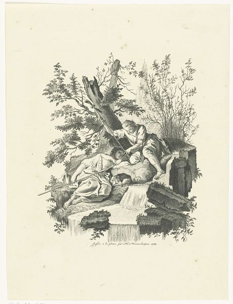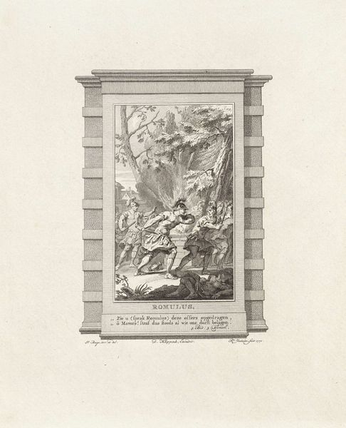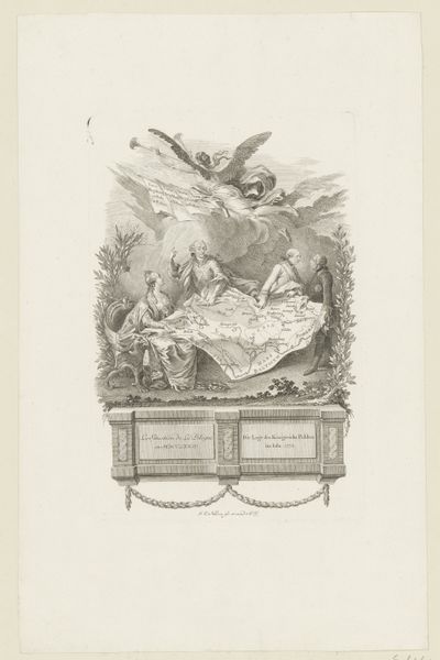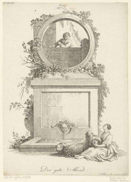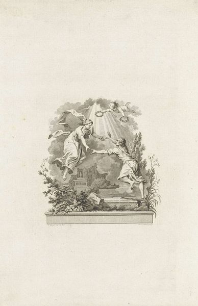 Reinier Vinkeles created this title page for ‘Lykdichten op Vrouwe Ida Cornelia Temminck’ using etching in the Netherlands. The print is a memorial to Ida Cornelia Temminck, and the image is loaded with allegorical content, a common practice for the time. We see a couple, presumably Ida and her partner, and an angel about to crown Ida with a wreath. Nearby, however, sits a skeleton, a stark reminder of mortality. In 18th-century Dutch culture, death was often depicted with such imagery, blending personal grief with broader philosophical meditations on life's transience. This memento mori tradition was popularized through the institutions of art like the church, where images of death served as moral lessons. To understand this print better, researching the Temminck family and the specific cultural conventions around death and mourning in the 18th-century Netherlands would be invaluable. The artwork’s value lies in its depiction of a specific time and place.