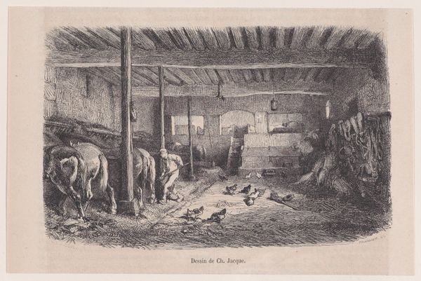 Editor: This is "The Dog Cart" by Charles Rochussen, made in 1855. It's a pencil drawing. The detail is amazing! I find the scene rather bleak; there's such an emphasis on the labor of the dogs, contrasting with the stillness of the figures near the building. What do you see when you look at it? Curator: The first thing that strikes me is the composition. Note how the artist uses a clear foreground, dominated by the dogs and cart, leading the eye towards the background figures and the suggestion of the building. Rochussen expertly uses line and shading to create depth. Observe the contrast between the densely packed lines forming the dogs’ bodies and the sparser, almost sketch-like quality of the distant church spire. The drawing's intrinsic value lies in this careful management of light and shadow to guide our vision. What impact do you believe this has? Editor: I guess it's meant to focus our attention. I hadn’t really considered how the values make the composition so readable. It emphasizes the immediate and weighty presence of the dogs and their task versus a more idealized world in the background. Curator: Precisely. And it’s important to appreciate how the stark realism here – the very materiality of the pencil strokes – challenges any easy romanticization. We're not just observing a genre scene; we're confronted with a calculated arrangement of forms designed to provoke a certain feeling. A feeling that emerges solely from how it is rendered and arranged visually. Editor: That makes me appreciate the artist's technical skill even more. Thank you for pointing out how composition creates feeling. Curator: A pleasure. It demonstrates that a deep understanding is achieved when form guides us towards the feeling and meaning.