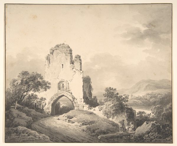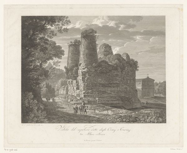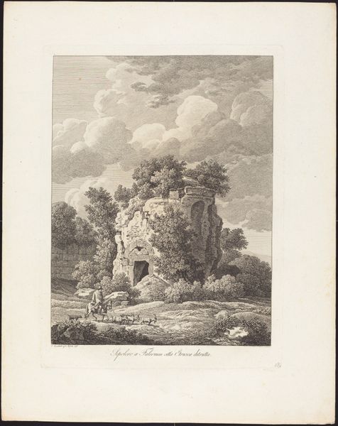 Jean Pelletier created this etching, "Landschap met herders en kudde," which translates to "Landscape with Shepherds and Herd," sometime in the 18th century. The print depicts an idealized pastoral scene, one which reflects the romanticized views of rural life prevalent among the French aristocracy before the revolution. The crumbling architecture is juxtaposed with grazing animals and figures, evoking themes of nature reclaiming civilization. This was a common trope, but it also subtly speaks to the social structures of the time. The shepherds represent an innocence and simplicity that was often contrasted with the perceived corruption of urban life. Consider how Pelletier, as an artist working in the service of the elite, both reinforced and perhaps subtly questioned these social hierarchies. What emotions do you think the artist wanted to evoke from the viewer? How might the experience of viewing this artwork shifted for audiences before and after the French Revolution?