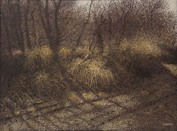 Curator: Caspar David Friedrich's oil painting, "Forrest in the end of the autumn," from 1835, presents a scene of melancholic beauty. The work is currently housed at the Angermuseum in Erfurt, Germany. Editor: The atmosphere is incredibly dense and oppressive; all that bare wood pushing in on itself creates a really palpable feeling of confinement. The brown tonality gives it an almost sepia-toned, photographic quality. Curator: Yes, and that restricted palette reflects a societal shift in Germany at the time, with increasing industrialization and urbanization leading artists and intellectuals to romanticize nature as an escape. The artwork plays into the burgeoning national identity seeking solace in representations of an idealized, untouched landscape. Editor: I'm especially drawn to the textures and the artist's manipulation of the oil paint; see how those intricate, interwoven branches are articulated. You can sense Friedrich painstakingly layering and working the paint. This isn't just landscape painting; it's about showing the physical labor and engagement that crafts that illusion, which I find fascinating. The painting is so clearly made, so intentionally built. Curator: Absolutely. And in exhibiting such meticulous craftsmanship, it resonated with the era’s socio-political sentiments. Consider Friedrich's role within the intellectual and artistic circles of Dresden and the influence of figures promoting nature as a source of moral and aesthetic authority; Friedrich’s choice of subject, his composition, became tools for promoting nationalist ideologies through art. Editor: Thinking of the painting in relation to craft, the fallen tree takes on another layer of meaning. It represents the transformation and decay essential to nature's cyclical processes. But at the time this landscape was painted it represented what? Change and transformation, new possibilities and perhaps hope? Curator: I find your observation extremely insightful. Considering what the landscape stands for symbolically is critical here; it is indeed a potent blend of personal experience, natural observation, and social commentary; so many complex threads being woven together! Editor: Indeed. A truly affecting experience considering this materialist perspective! Curator: I agree; this artwork encourages us to think more deeply about the role that art plays in reflecting and shaping our understanding of place and identity.