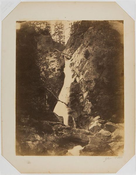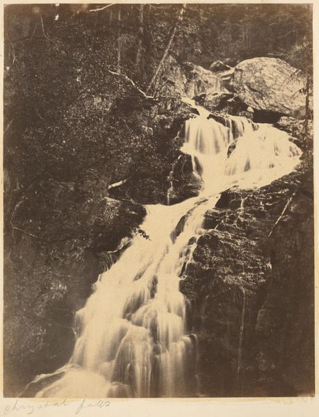 Curator: John Adams Whipple gives us "Artist's Falls, North Conway," a small photographic print housed here at the Harvard Art Museums. What strikes you first about it? Editor: The light is incredibly diffused, giving it a soft, almost dreamlike quality. It seems to be about the textures of the rocks and the suggestion of movement rather than a clear depiction of the falls. Curator: Absolutely. This image comes from a time when photography was rapidly evolving, transitioning from a novelty to a means of documentation and artistic expression. Whipple would have been experimenting with the materials and the photographic process. Editor: I can see the tension between art and craft. The way Whipple frames the composition—the play of light and shadow, the deliberate choices—these elevate it beyond mere record-keeping. Curator: And think about the viewers in the nineteenth century. This kind of image made landscapes accessible, connecting them to both nature and the social environment they lived in. Editor: Considering how the tonal gradations emphasize form and depth, there's a powerful visual experience packed into this modest image. Curator: Yes, seeing it through both the lens of its making and its inherent qualities really enriches one's understanding. Editor: Agreed. This photograph beautifully straddles representation and abstraction.