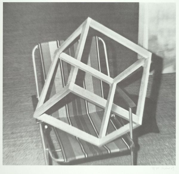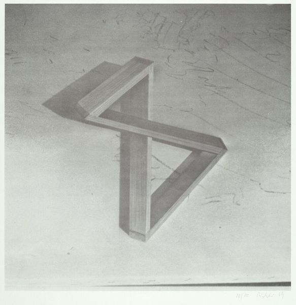 Curator: Here we have Gerhard Richter's "Untitled" print from the "9 Objects" portfolio. The work consists of a geometric shape resting on a textured surface. What's your first impression? Editor: It's unsettling. The stark contrast of light and shadow creates a strange, almost illusory space. The form itself feels incomplete. Curator: Richter often played with photographic realism and abstraction. This piece engages with the viewer's perception, challenging notions of representation within art history. Editor: Yes, the simplicity is deceptive. The object’s lines, the rough texture of the ground—it all hints at a deeper investigation into form and materiality. Curator: It reflects Richter’s broader exploration of how images circulate and are interpreted within a society saturated with mass media. Editor: True, and the shadow emphasizes the object's presence, forcing the viewer to confront the artwork's status as both object and image. Curator: Ultimately, it pushes us to reconsider the relationship between the real and the represented. Editor: It leaves you questioning what you think you see, a testament to the power of visual ambiguity.