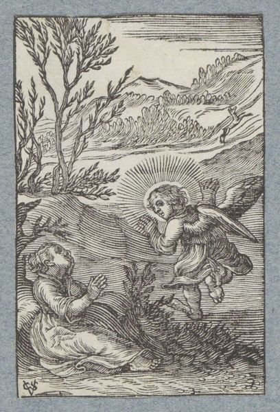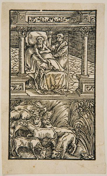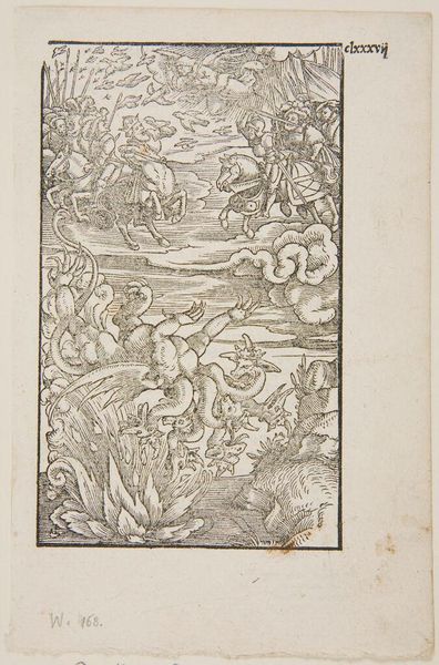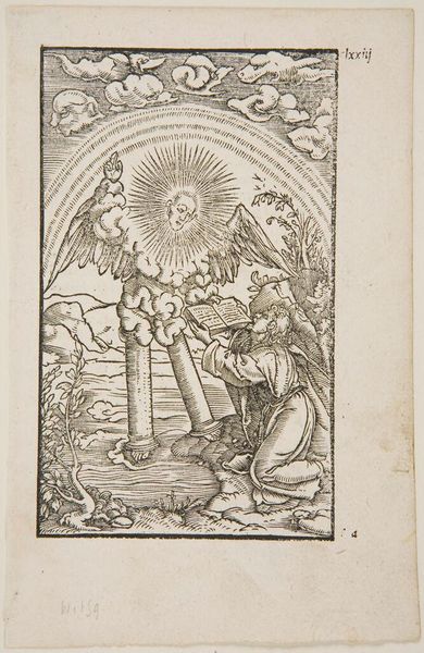 Editor: This woodcut, "The Woman clad with the sun, standing on the Moon, and the Dragon," is by Hans Holbein the Younger. It’s incredibly detailed. What symbols do you see as most powerful here? Curator: The woman herself, of course. Garbed in the sun, standing on the moon, crowned with stars, she evokes a powerful, timeless feminine archetype—a convergence of the maternal and the divine. Does it remind you of any other similar symbol? Editor: I guess it’s hard to miss the dragon, representing evil. But what about the sun, moon, and stars? Are they strictly religious? Curator: They certainly allude to the Book of Revelation, yet transcend mere illustration. Sun, moon, stars... these resonate deeply within the collective human psyche, representing cycles, hope, and the cosmos itself. Holbein taps into primal symbolism, a visual language understood across cultures. Editor: That's amazing. I hadn't thought about it like a common language. Curator: Indeed. Holbein layers meaning upon meaning, reminding us that images can hold both sacred and secular weight. It is an invitation to contemplate the enduring power of symbols.
