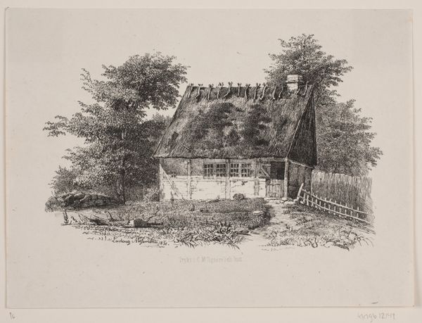 Editor: We're looking at "Boerenwoning tussen de bomen," a pencil drawing by Jean Baptiste Louis Hubert, created sometime between 1834 and 1838. The rendering of the building nestled amidst the foliage creates such a quaint and charming effect. What catches your eye about this work? Curator: The structural elements of this drawing showcase Hubert’s attention to detail, evident in the meticulous rendering of textures, such as the thatched roof and the stone facade of the house. Observe how Hubert employs line to delineate form and create depth; note, in particular, how the graded shading contributes to the volumetric sense of the foliage surrounding the cottage. Consider how the composition is divided; the foreground establishes a spatial context with foliage, leading the eye toward the centrally located cottage. What do you think about how the formal arrangement enhances its visual appeal? Editor: The light definitely seems focused on the cottage, making it the clear focal point, like it’s emerging from the surrounding shadows. That emphasis definitely makes the cottage feel prominent, yet cozy! Curator: Precisely. It’s this interplay between light and shadow, rendered through subtle gradations of pencil strokes, that bestows upon the artwork a certain atmospheric quality. Did you notice the absence of strong color to focus on forms and light interplay? Editor: That's right. I think I understand how a formalist perspective helps unpack these visual elements. It’s not just a picture of a cottage; it's a carefully constructed composition of shapes and lines. Curator: Indeed, and examining these elements gives insight into the artist’s method and intentions in their work. Editor: It all becomes clear now, Thank you.