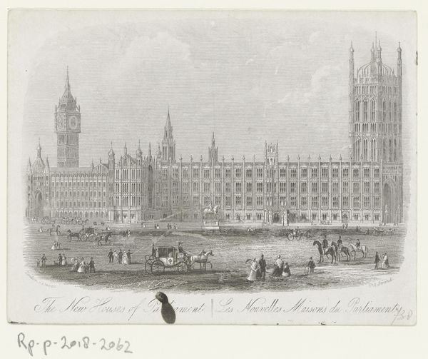 Curator: This engraving presents a view of the Houses of Parliament in London, dating back to somewhere between 1870 and 1885. Editor: My first thought is that the entire image is steeped in an almost ghostly calm. The intricate architectural detail feels so precise, almost unsettling, in the way it captures the imposing structure. Curator: The engraving technique itself lends to this sense of stillness and precision, doesn’t it? Every line carefully etched, creating a sense of order and permanence. Editor: Exactly. And I can't help but think about the political realities embodied within those walls. Parliament, especially then, stood as a symbol of both progress and immense inequality. Seeing these well-dressed figures milling in front, it strikes me how separate the gears of government were from the lives of ordinary people. Curator: Indeed. And beyond that direct symbolism of governance, one could examine the deliberate architectural choices, all pointing to a certain visual language that equates power with forms and lines... what do you read into that, particularly? Editor: The neoclassical style is clearly meant to evoke feelings of permanence and authority, which speaks volumes about how power structures were intended to be perceived during that time. But there is such clear exclusion: what of working-class communities or marginalized voices. Were these building blocks built on exclusion, would you say? Curator: Buildings become monuments; architecture becomes history, of course. These details serve a function not dissimilar to portraiture. Each tiny carefully selected choice presents meaning which could easily have gone in an entirely alternate route. It really speaks volumes about intentionality and historical symbolism... the more overt, the more subliminal the language and history being expressed! Editor: Yes, I agree. While at first glance it might appear to simply be an accurate rendition of architecture, further consideration is required, and there remains much to reflect upon... Curator: Absolutely, a deeper dive really demonstrates what historical contexts this snapshot invokes. Thank you.