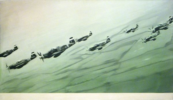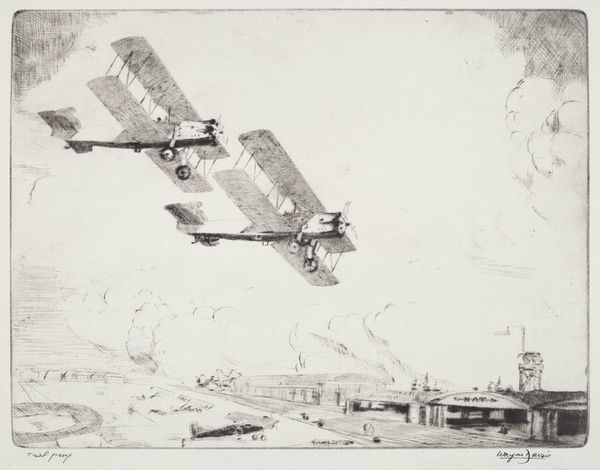 Eric Ravilious made this watercolor painting, titled "Tiger Moth," sometime before his death in 1942. Ravilious was a master of the watercolor medium, embracing its inherent qualities of transparency and fluidity to create a dream-like, evocative scene. See how he allows the paper’s surface to shine through, giving the image a luminosity that feels very English, in its own way very modern. The seemingly simple technique belies Ravilious’s skill: notice the detailed rendering of the Tiger Moth airplane, its delicate structure and bright yellow wings contrasting with the muted tones of the landscape. Ravilious was working as a war artist at the time, and while this image has a nostalgic quality, there's also a clear-eyed appreciation of technological power here. The carefully delineated forms of the aircraft and the regimented furrows in the field suggest the increasing mechanization of both warfare and agriculture. By focusing on the materials and techniques employed in this artwork, we can gain a deeper understanding of Ravilious’s artistic vision and its cultural context.