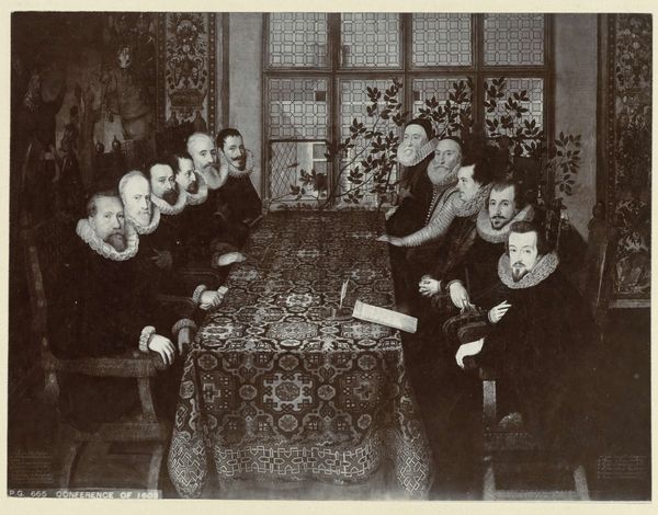 Curator: My first impression is the image has such incredible light—like an old photograph. So moody, and I am struck by the calm in these faces. Editor: What draws me in immediately is the stark social realism. It looks as though we have stepped into an intimate gathering, the title is "On a Visit to the Teacher," and is by Nikolay Bogdanov-Belsky. Curator: Social Realism is such a serious-sounding term for an image with what strikes me is its profound sense of intimacy, despite the lack of any color! I get the sense this room is overflowing with stories and shared experiences. Editor: I am interested in this "photographic quality," and its lack of color...this piece is actually a charcoal drawing! Imagine recreating such incredible realism with charcoal, a medium normally known for preliminary sketching. And those present show what seems to be a mix of intellectual debate and quiet contemplation; I wonder how that affects its initial reception... Curator: Precisely. It’s almost deceptive, and gives off an air of lived authenticity, or nostalgia. There's that samovar on the table! Reminds me of my grandmother...And what stories would this room have, if these walls could talk? This makes you wonder—are these historical or fictional, in a way, images? Editor: Exactly! It transports you. It begs questions. Given the era, you know, these works often functioned as a powerful form of social commentary, especially with the politics tied to education for the Russian peasantry in that period. We see this theme revisited in other work from this artist... Curator: Yes, a potent reminder of the past... I wonder if someone will view this one hundred years from now and ponder about us? That thought makes me chuckle—it's oddly unsettling. Editor: It is humbling, isn't it? Makes you consider how we construct both images and our stories within them. A pretty insightful study on art, access and aspiration!
