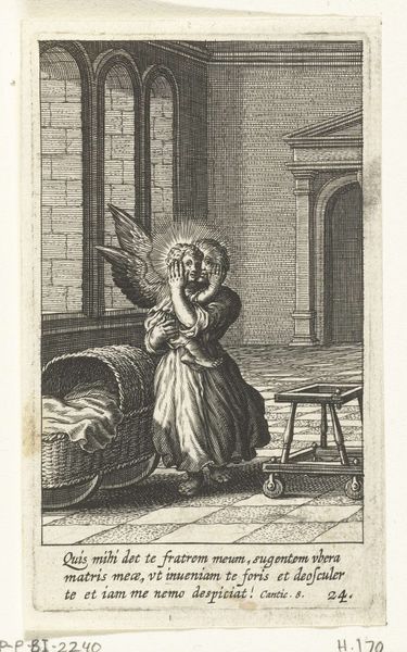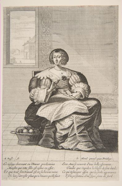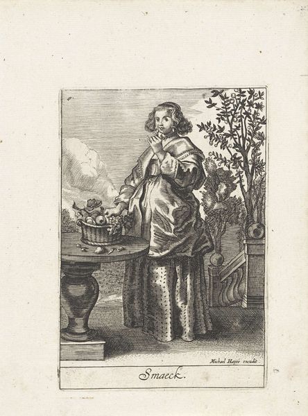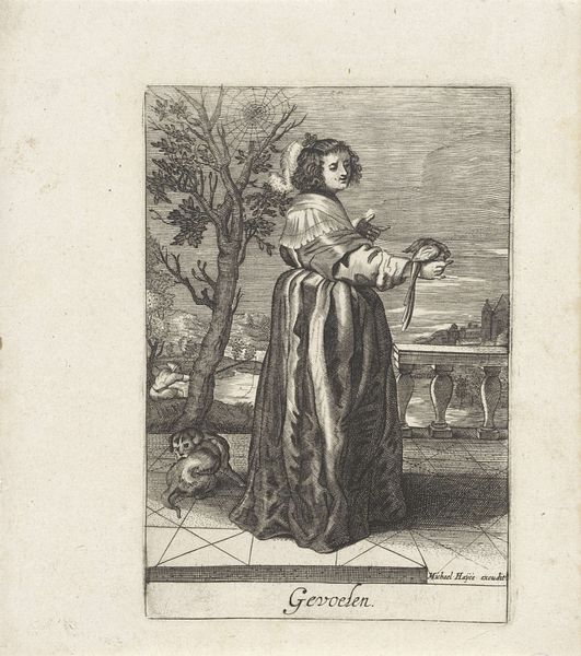 This is an undated engraving titled "Gezicht," made by an anonymous artist. The composition features a woman applying makeup before a mirror, set against an outdoor backdrop with an eagle perched nearby. The engraving's visual structure pivots on the contrast between the human and the natural, the refined and the wild. Note how the lines define the texture of fabrics and feathers differently. The woman's pose, combined with the mirror, creates a mise-en-abyme, a mirroring effect that complicates the viewer's perspective and understanding of reality versus representation. The woman's adornment is juxtaposed with the raw, untamed presence of the eagle. This challenges fixed categories, destabilizing traditional associations between beauty and nature. In closing, the engraving's detailed lines and composition highlight the complex interplay between surface and depth. It invites us to reflect on how we construct meaning through visual signs and cultural codes.