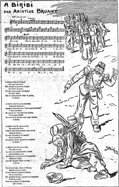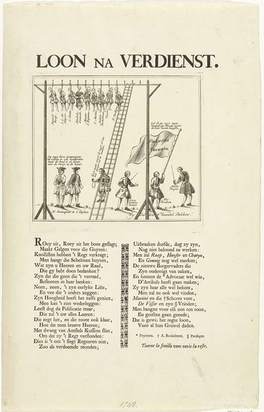 Editor: This is a political cartoon titled "Spotprent op de nederlagen van Frankrijk in 1870-1871," placing it during the Franco-Prussian War. It’s an anonymous print – an engraving, I believe – currently held at the Rijksmuseum. The imagery is so striking, almost grotesque! What do you see in this piece, particularly within its historical context? Curator: It’s a potent piece of propaganda, reflecting the surge of German nationalism during the war. Notice how the artist depicts figures representing different German states. They’re all linked, physically supporting caricatures of defeated French figures. This suggests a unified Germany triumphing over France. Editor: The figures are labeled with state names! And the defeated French are… labeled with who, exactly? Curator: They bear the names of prominent French figures, maybe military leaders. Look at the aggressive expressions on the faces of the German figures versus the almost pitiful state of the French. This visual disparity underscores the intended message of German superiority. Consider where this image might have been displayed and how that might influence the public role of art. Editor: So, this wasn't necessarily about documenting history, but shaping public perception of the war, right? Using caricature and association to amplify nationalistic sentiment. Curator: Precisely. And consider the text beneath the image, a rousing song seemingly meant to further stir patriotic fervor. What do you make of the work being anonymous? Editor: Perhaps that anonymity allows it to function more readily as a generalized expression of collective sentiment, rather than being tied to a particular individual’s views. It kind of takes on a life of its own, as an idea. Curator: Exactly. The politics of imagery are often amplified when they appear to arise organically from the collective consciousness. Editor: I see, that’s really insightful. I hadn't fully considered how anonymity plays into the reception. Thanks for providing context on the piece, I was laser focused on the central images!
