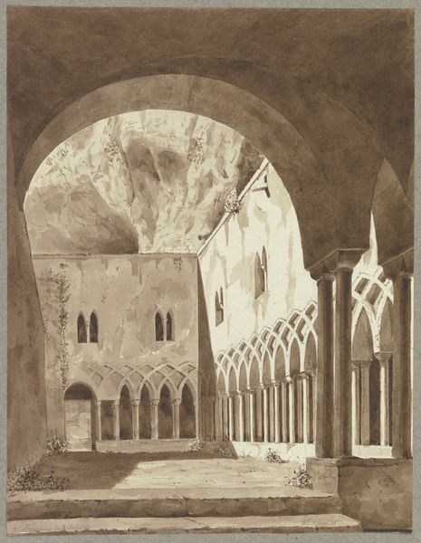 Editor: So, this is John Sell Cotman's "Norwich Cathedral; Entrance to Jesus Chapel," created around 1807, using ink, pencil, and watercolor. It's incredibly atmospheric, almost haunting, with this strong contrast between light and shadow. What do you see in this piece, from your perspective? Curator: I see echoes of sacred spaces, and how light shapes our perception of them. The chiaroscuro isn't just aesthetic; it's symbolic. Think of light as divine presence, illuminating a path through the unknown, represented by the darkened archway. Cathedrals, historically, were meant to inspire awe, but also to humble. Notice the emphasis on verticality versus the subdued horizontal plane: Cotman isn’t simply depicting a place but the *feeling* of the place, its cultural memory encoded in its very structure. What feelings are stirred in you when viewing that darkness under the arch? Editor: That sense of 'divine presence' makes perfect sense given it's a cathedral. That darkness does intrigue me…almost a dare to venture into the unknown. How do you think viewers at the time, around 1807, would have responded to it? Curator: Intrigue, I suspect, mixed with perhaps a frisson of gothic sensibility that was gaining popularity. These structures represented both civic pride and spiritual comfort but also the weight of history, the receding Medieval past. Cotman highlights not just the grandeur but that tension between familiarity and otherness that Gothic architecture so expertly evokes. The ruin, the fragment, those imperfections spoke loudly to early 19th century viewers invested in notions of landscape as more than just pretty. They held, in other words, psychological weight. Do you sense any of that? Editor: Definitely, the psychological weight… it makes me consider the enduring power of symbols and architecture. It's not just about what is depicted but the ideas it triggers and memories that linger, even for us today. Curator: Precisely. Cotman's not simply presenting an image; he's providing a portal into something much deeper, something lasting. Editor: That's a wonderful way to consider Cotman's vision! It's transformed my understanding.
