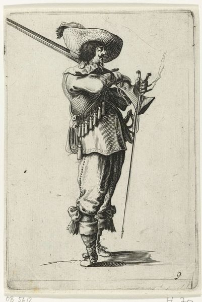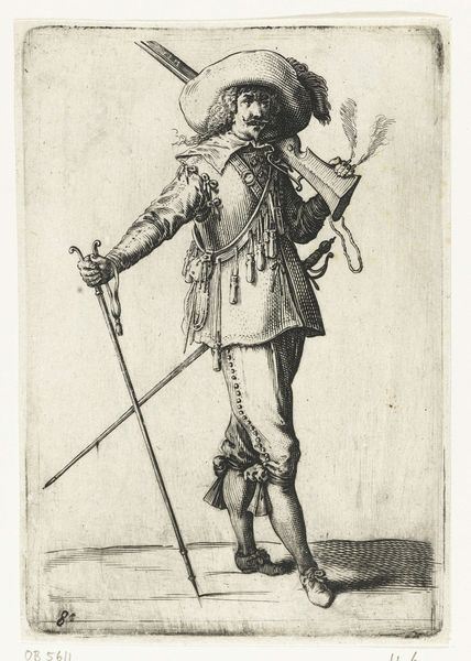 Petrus Rucholle made this engraving of a soldier around 1645, during a period of significant military and political upheaval in Europe. The soldier, with his musket casually slung over his shoulder, embodies both power and vulnerability. His stance suggests a readiness for conflict, yet there's a softness to his features and attire, hinting at the human cost of war. This image offers insight into the complex identities of soldiers of the time. The fancy details and adornments on his clothing contrast sharply with the deadly weapon he carries, blurring lines of class and gender. The print complicates traditional narratives of masculinity, as the soldier’s self-presentation involves elements of both aggression and refinement. Through this image, Rucholle invites us to reflect on the personal stories embedded within broader historical conflicts, and to recognize the emotional dimensions of those who served.