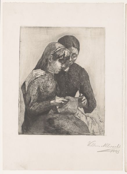 Curator: I find a delicate sense of shared intimacy emanating from Willem Albracht’s 1883 etching, "Two Seated Women Reading a Letter Together". It’s a study in concentrated absorption, isn’t it? Editor: The weight of the scene really strikes me. It’s rendered in a humble, almost austere style. I'm thinking of the labor involved in etching: the meticulous work with acid on metal plate, producing this detailed scene of domestic life. The finished piece embodies both a skilled craft and quiet hardship. Curator: Note how Albracht deploys shadow and light. See the distinct contrast between the figures, and the subtle modelling that sculpts form, imparting emotional weight through purely visual means. There's also the visual symbolism, right? The letter itself acting as the pivotal point. Editor: Absolutely. The choice of materials – the etching medium itself – amplifies this feeling. It allows for incredible detail but requires significant labour, resonating with the implied labour and lives of the subjects themselves. This reinforces its place within a 19th-century realist style, documenting daily realities without gloss. The materiality emphasizes process and purpose. Curator: And in their faces, we are witnesses to some inner unfolding revealed through Albracht's artful composition of gesture and gaze, focusing our own perspective on how the text shapes their shared moment. I can't help but feel drawn into the mystery of their experience. Editor: It’s true. I agree, too, about the symbolism within the etching technique. There's a definite social context at play here as well: letter writing as a key form of communication. These letters and etchings speak across generations in how communication practices can foster intimacy in certain societies. Curator: Exactly. By closely analyzing Albracht’s choices, the relationship among style, composition, and process elevates everyday interaction and unveils layers of meaning—and that, for me, is art’s primary function. Editor: Yes, indeed. It reminds me again of the many skilled, nameless hands contributing to our cultural heritage, each object holding stories that tell us a lot about art.