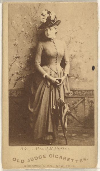 Curator: Welcome. We are standing before "Emily Bancker, from the Actors and Actresses series," dating circa 1890-1895. These portrait prints were produced by W. Duke, Sons & Co. as promotional items for Duke Cigarettes and became quite collectible at the time. Editor: It has such a melancholic quality. The sepia tone and the way her dress blends into the background, the fleur-de-lis wallpaper, it all creates this wonderfully faded atmosphere. Curator: Indeed, it's essential to consider these cards as part of the burgeoning consumer culture. The material object itself, this small print on paper, speaks to the intersection of entertainment, advertising, and the everyday lives of people acquiring and collecting them. Editor: What I find fascinating is the composition. Bancker’s averted gaze draws you in but then deflects any sense of genuine connection. Her stance feels rather formal, a common feature in portraiture of the period. It's all quite calculated, wouldn't you say? Curator: Calculated, certainly, within the means of production. These cards weren’t intended as high art. They were a low-cost, mass-produced commodity meant to drive sales of cigarettes. Her carefully chosen outfit and poised stance highlight her as a marketable commodity herself, playing into the idealized image of the actress. The choice of photography printed on paper shows this transitional state. Editor: I appreciate your emphasis on its cultural and economic purpose. Still, one cannot dismiss the purely visual effects. The soft gradations of tone and the interplay between the figure and the ground create a compelling image. There's also a deliberate flattening of space, almost echoing the conventions of theatrical set design. Curator: That "flattening" served to make reproduction cheaper. Every aspect, down to the paper quality, determined its value and availability in relation to cigarette purchases, shaping access and the audience. Editor: Well, viewing it now, the confluence of art, commerce, and performance that this little print embodies is what fascinates me the most. Curator: Exactly. By analyzing its context, materials, and means of distribution, we start to uncover deeper truths about labor, class, and consumer desire. Thank you for joining me today!