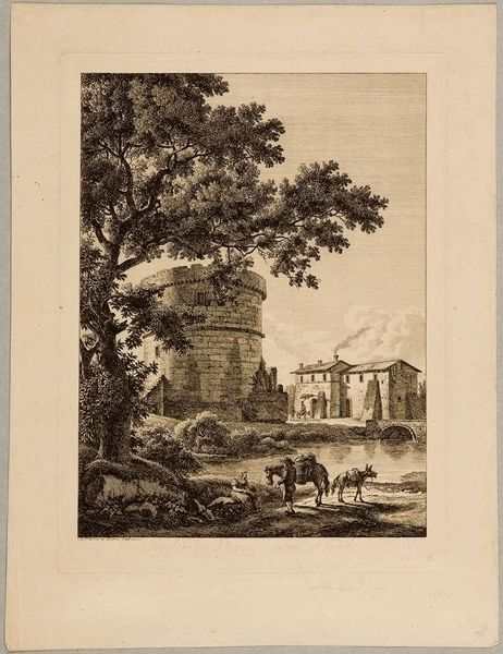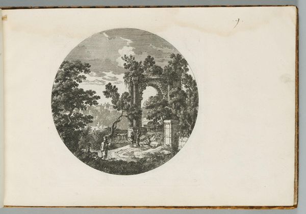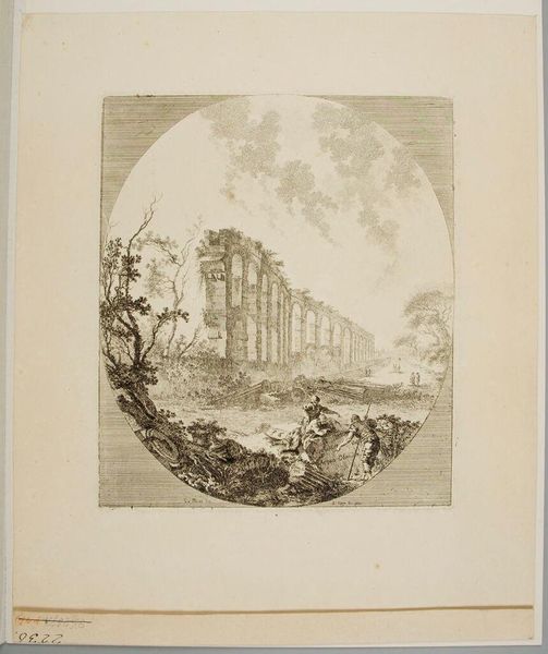 Curator: This is Jean-Claude Richard, Abbé de Saint-Non’s "Temple at Pola in Istria," housed here at the Harvard Art Museums. Editor: It has a melancholic feel. The stark lines and the oval frame make the temple seem isolated, a ruin in its own little world. Curator: The temple's integration within the landscape is interesting, isn't it? It speaks to the 18th-century fascination with classical ruins and their place within the contemporary world. Editor: Absolutely. Note how the vegetation almost overwhelms the structure. It is as if time and nature conspire to reclaim these symbols of power, whispering of mortality and decay. Curator: Indeed. Also, the composition invites questions about power structures, the passage of time, and how societies engage with legacies. Editor: The visual symbols of nature reclaiming this temple carry an emotional weight, a bittersweet meditation on human ambition and inevitable decline. Curator: Considering its historical context, this piece reflects the changing attitudes towards antiquity during the Enlightenment. Editor: A single image evokes the layers of historical narrative, revealing the psychological weight of human history. Curator: Well said. It's striking how a seemingly simple image can provoke such complex contemplation. Editor: Precisely, isn’t it wonderful how visual language transcends time?