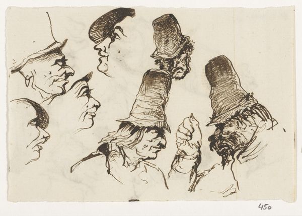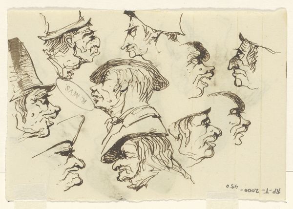 Editor: We are looking at "Koppen," an ink drawing from somewhere between 1840 and 1880, by Johannes Tavenraat, in the Rijksmuseum collection. It shows a series of quirky faces, almost like caricatures. The quick, almost frantic line work makes the images jump out at you! What can you tell me about what you see in this drawing? Curator: What strikes me first is the dynamism achieved through the economy of line. Tavenraat utilizes contour and hatching, predominantly, to suggest form, volume, and even personality. The density of the lines varies, creating areas of visual interest. Consider the hats, for example; they aren't mere coverings but structural elements that give a peculiar status to their wearers. Note the repetition of certain shapes--the noses, in particular--which gives the composition a strong sense of visual unity. Editor: I notice the exaggerated noses, too. Is that kind of exaggeration a typical characteristic of caricature? Curator: Indeed. But more than caricature, I see a study in physiognomy, the belief that facial features reveal inner character. The artist isn't merely copying appearance but attempting to extract a visual essence. Ask yourself, how do the precise lines used to construct the faces influence our reading of them? Editor: So it's not just about the subject of the drawing but also about the artist’s choice of lines and shapes that tells us something? It's more than just simple sketches? Curator: Precisely! The relationships between line weight, form, and composition invite us to explore the inherent language of art itself, beyond mere representation. What do you take away from this deeper observation? Editor: I'm beginning to see how every choice contributes to the overall effect, and that the beauty isn't just in the representation, but in the artistic construction of that representation. I see the relationship now. Thank you!