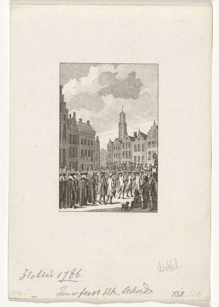 Reinier Vinkeles made this etching, "Inhaling van de Harlinger Gecommitteerden te Leeuwarden, 1748," which translates to "Entry of the Commissioners of Harlingen in Leeuwarden," after 1748. Vinkeles was born in the Netherlands during the Dutch Golden Age, a period defined by unprecedented economic growth, global trade, and cultural flourishing. Here we see a parade, probably related to civic governance. Notice the musicians at the front of the procession, and the crowd of onlookers. The scene is set against the backdrop of a typical Dutch city street. These distinct architectural features, with their stepped gables and narrow facades, speak to the urban landscape of the time. This imagery offers a glimpse into the cultural and political life of the Dutch Republic. To fully understand this etching, we can research Dutch political history and its urban centers of commerce during the 18th century. In doing so, we can appreciate the artwork not just for its aesthetic qualities but for its role as a historical document.