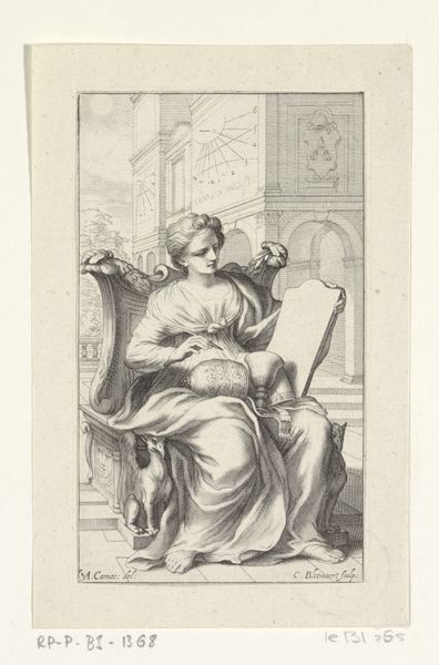 Editor: We're looking at "Young Woman with a Staff and a Roll of Paper in front of a Temple," an engraving by Reinier Vinkeles, dating roughly from 1751 to 1816. It’s so detailed, and has a very formal feel to it, quite proper. What strikes you most about this print? Curator: Proper indeed, like a well-mannered thought. I see echoes of aspiration and intellect swirling in those lines. The young woman, draped in classical garb, cradles not just paper but potential, the very blueprint of an enlightened age! Look at the temple in the background, practically whispering tales of reason and order. I'm drawn to the way Vinkeles contrasts the soft, organic curves of the foliage with the rigid geometry of the architecture. Is she reality or allegory do you suppose? Does she capture how something ordered can grow organically? Editor: I hadn’t considered the contrast, or her being an allegory for enlightenment. Now I'm also wondering about the paper--is she the author of her own story? What are your impressions of that line work, though? Seems very precise and…controlled? Curator: Absolutely! That controlled line work lends it a crisp, intellectual air. Vinkeles wasn't just replicating; he was constructing an ideal. Notice how the lines almost seem to breathe, guiding your eye through the scene, like following an elegant argument to its logical conclusion. Does this 'reasoned' approach make you like it more, or less? Editor: It makes me respect the artist's intention. It's a different approach than modern art for sure. It seems so deliberate. Curator: Deliberate, yes, almost like a carefully worded philosophical statement etched in ink. It really causes one to consider and appreciate the art that one produces today! Editor: Definitely gives me a new lens to see things through.