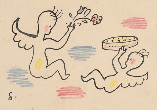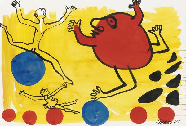 Curator: Alexander Calder’s "Monsieur Loyal," painted in acrylic on canvas in 1974, strikes a distinctive tone. Editor: Yes, the piece gives an impression of organized chaos; there's a delightful lack of realism in the figures, making the entire canvas read like a playful composition. The lack of depth is interesting, too. Curator: Precisely. The flattened perspective serves to amplify the graphic nature of each component. Notice the limited color palette—vivid reds, blues, and yellows, offset by black outlines. The strategic arrangement creates a dynamic, albeit intentionally distorted, space. Each form occupies its zone with deliberate effect. Editor: I’m drawn to the figures, though—particularly how the circus ringmaster at the center stages the chaos. With the stripe, he's channeling that primal urge of dominance through the symbols of the big top; whip, top hat, he stands right above this crude red animal figure that can also be seen as his own primal impulse and the source of his own mastery. The acrobat too embodies that, reaching with the umbrella in what feels to me like some kind of aspiration. Curator: A compelling interpretation! Calder does indeed employ semiotic language. The abstracted animal and human forms do not represent physical likeness so much as encapsulate concepts of action and energy through simple colors and outlines. Notice that Calder utilizes line in particular ways—thick, dark contours give way to finer lines in the rigging; it allows him to explore contrast between bold statement and suggestion. Editor: You’re right, and considering Calder's broader artistic language that really aligns with the notion of bringing the invisible or hidden structures to life and allowing audiences access. A crude drawing contains more magic than hyper-realism. It also speaks to themes of control versus freedom within our shared culture—that circus scene holds many potent cultural symbols. Curator: That cultural layering, interwoven with careful composition, ultimately gives Calder’s “Monsieur Loyal” a structural framework that supports complex expression. Editor: In essence, "Monsieur Loyal" resonates because its simplicity unlocks access to our own symbolic libraries.
