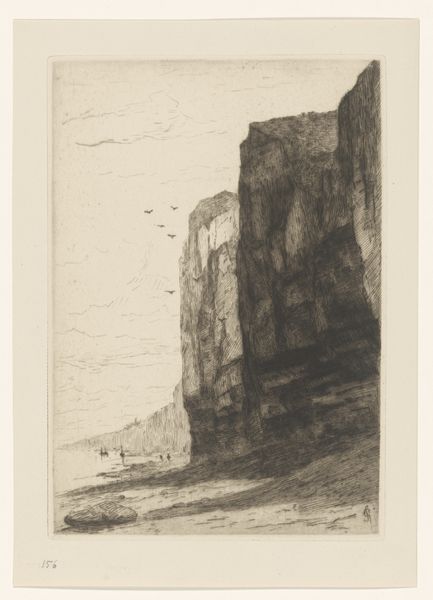 Curator: Let's delve into this print: "View of Walzin Castle," dating from around 1890 to 1930, crafted by Philip Zilcken. The etching, with its fine lines, captures the dramatic architecture of the castle. What's your initial take on this one? Editor: Oof, precarious! I immediately feel the chill wind whistling around that castle, perched so high on that rock. The stark line work somehow makes it feel isolated and a little ghostly. Curator: The isolation is key. Zilcken highlights not just the castle's beauty but its strategic position. These structures asserted power over the landscape, didn't they? Control of trade routes, defense... the imagery played a pivotal role. Editor: Absolutely, the politics are there, implicit in the looming presence. But my eye keeps wandering to those birds. See how they’re sort of flocking almost aimlessly. Is Zilcken suggesting freedom even within these strict social orders or...? Maybe it’s just the artist wanting to add life? Curator: Perhaps both. Zilcken was definitely influenced by the Hague School, so rendering light and atmosphere were paramount. Yet, these landscape prints served an important function. Circulating such views fostered national pride and, frankly, tourist revenue. The picturesque sells! Editor: Haha, “picturesque” indeed. Though I think the brooding drama here has a sharper edge than your typical pretty postcard. You feel that history clinging to the rock face, every stroke laden with something a bit...unsettled. Almost gothic in its intensity. Curator: Well said! Consider how easily this piece could feed into anxieties of the time, of losing traditional power structures even amidst rapid industrial growth. Nostalgia and dread mingled. Editor: It’s powerful. Makes me want to see the real thing… but maybe with a friend and in broad daylight! Anyway, it really encapsulates that sense of awe tinged with a bit of fear you sometimes feel in confrontation of the raw, overwhelming powers that predate you... What do you think? Curator: Agreed, the power of the setting is what lingers. Editor: Absolutely! Well, onto the next precipice, metaphorically speaking.