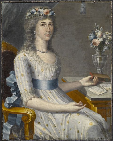 Curator: Lawrence Kilburn, or Kilbrunn, depending on which record you consult, painted this "Portrait of a Lady" in 1764. It resides here at the Metropolitan Museum of Art. Editor: It feels like stepping into a powdered wig time machine, doesn't it? Those pastel hues and the demure gaze… yet, there’s a disquieting formality. Makes you wonder what was she thinking? Curator: Absolutely. Note the fabrics—the satin dress, the delicate lace, even the small wrist adornment, probably crafted by specialized artisans. Each element indicates access, wealth, and specific social standing. Her class is legible through the visible labor embodied in these objects. Editor: It's a doll's house portrait, really. She's posed with those perfect little roses. I find myself drawn to that slight frown—a hint of a rebellious spirit lurking beneath all that propriety? It feels more 'alive' than the flowers. Curator: The contrast is apt. We should consider the politics of Rococo portraiture in the context of the burgeoning Enlightenment. Artists often walked a line: showcasing luxury, but also hinting at emerging ideologies. It's also worth considering this artist's trajectory through the historical record and what limitations that history would place on access to materials and commissions. Editor: Yes! Perhaps these rosy details are carefully chosen indicators that help a lady subtly stake her place within the restrictive frame she inherited? Kilburn captured more than just fabric and form. She feels ready to take up needlework and poetry one moment and incite a quiet revolution in the next. It might be how much the flowers give an organic and ephemeral impression in stark contrast to her static position and steely face. Curator: A plausible interpretation. But by emphasizing the constraints and the calculated display of affluence and aspiration, we can expose how such portraits became integral in structuring a certain form of social order and power dynamic during the period. It tells us so much about the mechanisms through which an artwork reflects its societal making. Editor: Fair enough. Though sometimes I think it's the unseen stories whispering beneath the veneer that are more resonant to me, perhaps? Those imagined rebellious inclinations dancing on the tip of her 18th-century tongue. It's where humanity breaches into artistry. Curator: Well, on that evocative note, shall we proceed to the next painting? Editor: Lead the way!