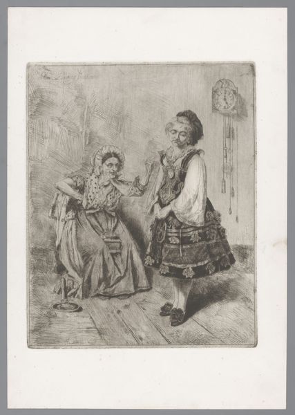 Curator: Here we have "Dwarf Musicians of Granada," a pen and ink drawing by Gustave Doré, dating from approximately 1861 to 1862. Editor: Well, right off the bat, it's got a lively feel! You can practically hear the music—makes you want to clap along, even though it’s just a drawing. Curator: The composition indeed contributes significantly to this impression. Doré employs a dynamic arrangement of figures, each engaging the viewer with direct eye contact or animated gesture, while the deliberate contrasts of light and shadow sculpt their forms and lend the image an engaging vivacity. Editor: Exactly! It's more than just a picture; it’s like catching a fleeting moment. But there’s something melancholic too, a bit… bittersweet, maybe? It's those shadows lurking around them, clinging to the wall like secrets. And is that a bowl for coin I spot? Curator: Your observations are astute. That shadow work can be seen as Doré’s attempt to create a subtext to this street scene, a theme enhanced by the subtle use of line weight in each stroke. Editor: I think, maybe Doré captured not just the sounds but the soul of those two little players. They’re so focused and passionate. I’ve seen that fire in performers eyes. It's beautiful! And the scratch of the pen gives it this raw energy… almost like he was sketching as the music swirled around him. Curator: We agree that Doré used the simple tools to their maximal expressive value. These dwarf musicians serve as exemplars of a broader segment of society, captured candidly, in their vibrant occupation. Editor: I am seeing echoes of Goya's darkness with flashes of unvarnished human expression, captured with the frenetic energy of someone jotting in a travel diary. But look again... beneath that grin you detect weariness, something deeper? The very essence of survival etched in the face. Curator: Your point regarding the psychological complexity resonates. Doré’s artwork is more than mere figuration; it is a complex tableau prompting multilayered reflections on marginalization, resilience and the enduring spirit of artistic expression. Editor: Yeah, I walked in ready for some music, but leaving with… a whole story! And some thoughts I hadn't expected. Curator: And hopefully that offers a perspective for those that see this next.