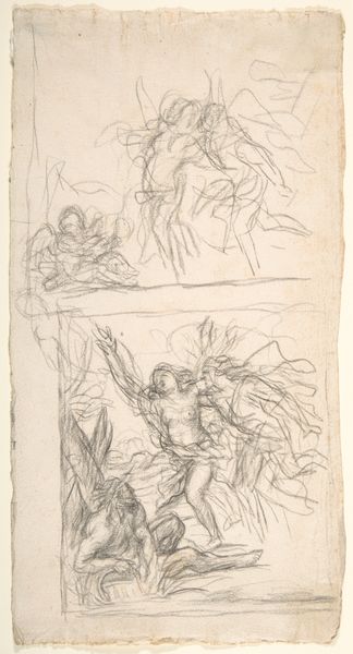 Curator: Here we have Théodore Géricault's "Study of Napoleon on Horseback with Sketches of Nudes Among Rocks," created around 1813-1814. It’s currently held here at the Art Institute of Chicago. Editor: It's like catching a glimpse into his mind! Such dynamism, though unfinished. A blend of power and vulnerability swirling on paper with pen, ink, and graphite. The Napoleon figure is faint like a ghost; it makes one consider fleeting victories and enduring human form. Curator: Indeed. Consider the juxtaposition. The figure of Napoleon, presented almost as an afterthought, sketched lightly, in contrast to the more robust, defined nudes. It compels us to deconstruct prevailing ideals of heroism, contrasting military might with the timelessness of the human body. Observe the lines, how the hatching defines form, especially in the figures on the rocks, embodying the ideals of Romanticism through heightened emotion. Editor: Right! There's this tension, this dance between impermanence, hinted at with Napoleon, and enduring existence in the nudes. The composition vibrates, literally, between sketches and the finished form—leading with bold strokes around those gorgeous nudes as well as fainter lines portraying the doomed emperor. Géricault uses this space to express grand historic ambitions set against elemental, human nature. And what’s with the title? "Study of Napoleon"? Yet your eye's snagged elsewhere—cheeky and a bit perverse. Curator: Precisely. Géricault cleverly subverts expectation, prioritizing these figures divorced from narrative. Structurally, the rocky ground and shading also perform double duty, literally grounding these men, who might feel less imposing otherwise, while simultaneously contrasting the lack of similar treatment afforded to the political leader, positioned as he is off to the side of the work. Editor: The piece reads as a fragment, a rehearsal, rather than a final act—allowing us the privilege of feeling party to its creation! He offers the heroic alongside the vulnerable. How clever and generous of him. Curator: He provides us space for interpreting multiple positions, which is itself a progressive act. In his layering of themes and styles, we witness more than merely technical prowess but a layered interrogation. Editor: The sheer energy distilled within those ink strokes remains captivating. It's a beautiful collision of historical might with primal beauty.