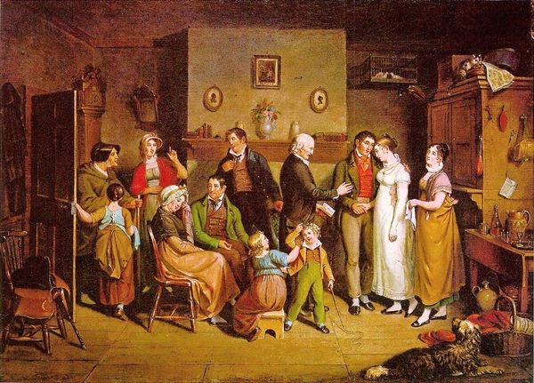 Curator: Let's take a closer look at "In an American Inn," an oil painting created in 1814 by John Lewis Krimmel. It's a bustling scene. Editor: Yes, immediate impression: clamorous, convivial, a touch chaotic, and intensely masculine despite the women present. What do you think about the gender representation in this tableau? Curator: Well, genre painting in this period often depicted idealized or romanticized scenes of everyday life, often obscuring actual life for women and under-represented communities. Editor: Exactly. Who gets to participate in this "American" experience is visibly limited. It is telling that the narrative excludes the voices and bodies that shape our social existence, such as queer people and people of color. Curator: In this crowded tavern scene, Krimmel illustrates an interior, filled with men drinking, gambling, reading. There's even a small dog resting under a table, adding to the sense of candid observation. But, as you point out, it's selective. Editor: The composition is quite theatrical. Consider the way the artist uses light—almost like a stage spotlight—to focus our attention on certain figures and interactions, subtly drawing the viewer into this curated world. It reminds me how crucial art and historical images were in promoting a nation-building project at the time. What were these spaces? Were these true democratic spaces for dialogue, or more akin to spaces for solidifying a white patriarchal project? Curator: Krimmel arrived in America from Germany around 1809. His genre scenes are fascinating records of early 19th-century American life. His pieces helped shape visual culture that romanticized daily life as entertainment. Editor: And, like so much genre painting of the era, there's an undeniable sense of… exclusion. The promise of this interior world wasn't accessible for many who are written out. A nuanced consideration of our nation’s origins demands a more thorough intersectional and critical awareness. Curator: Agreed. Studying works like this allows us to dissect the ways history is told and by whom. Editor: Yes, precisely; by confronting and acknowledging its silences, we start the dialogue necessary for an equitable and accurate representation.